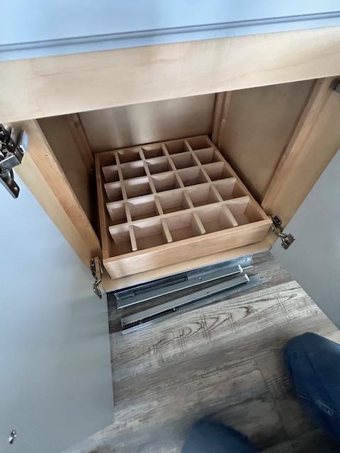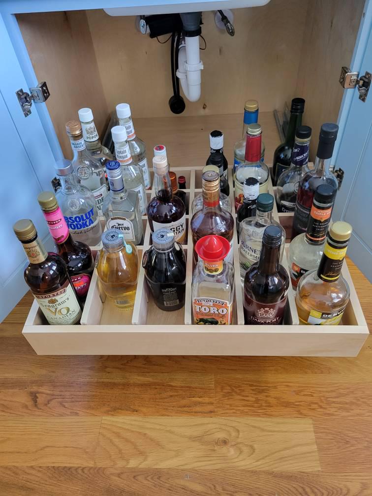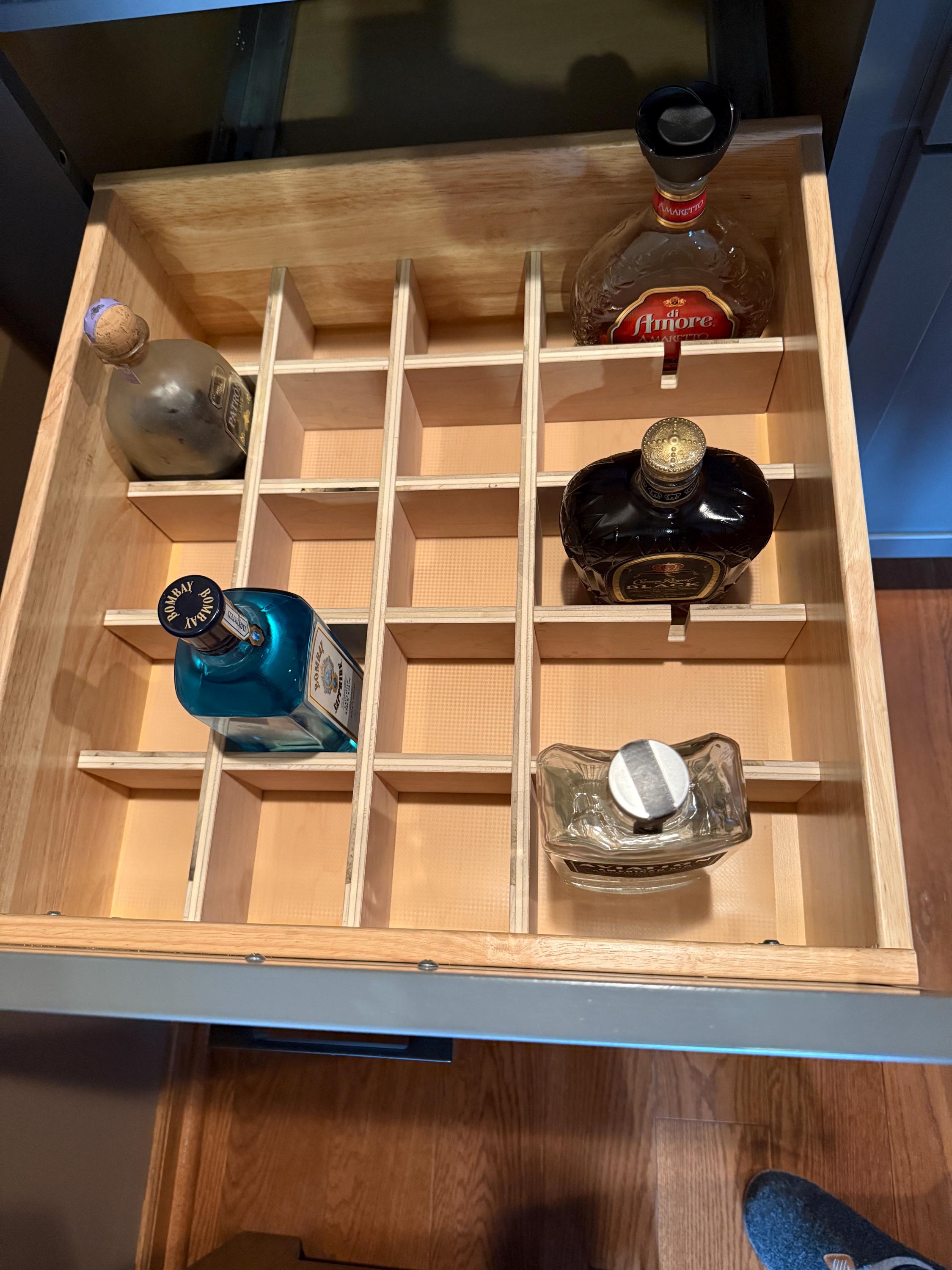 Our interlocking drawer dividers are the perfect solution for stabilizing bottles that are stored in pull out drawers. They may also be used in a vertical format as a wine/bottle rack with the right depth and mounting. Available in 1/2" unfinished birch plywood and 1/2" white PVC. The PVC is washable and waterproof, but we recommend sealing the birch prior to use.